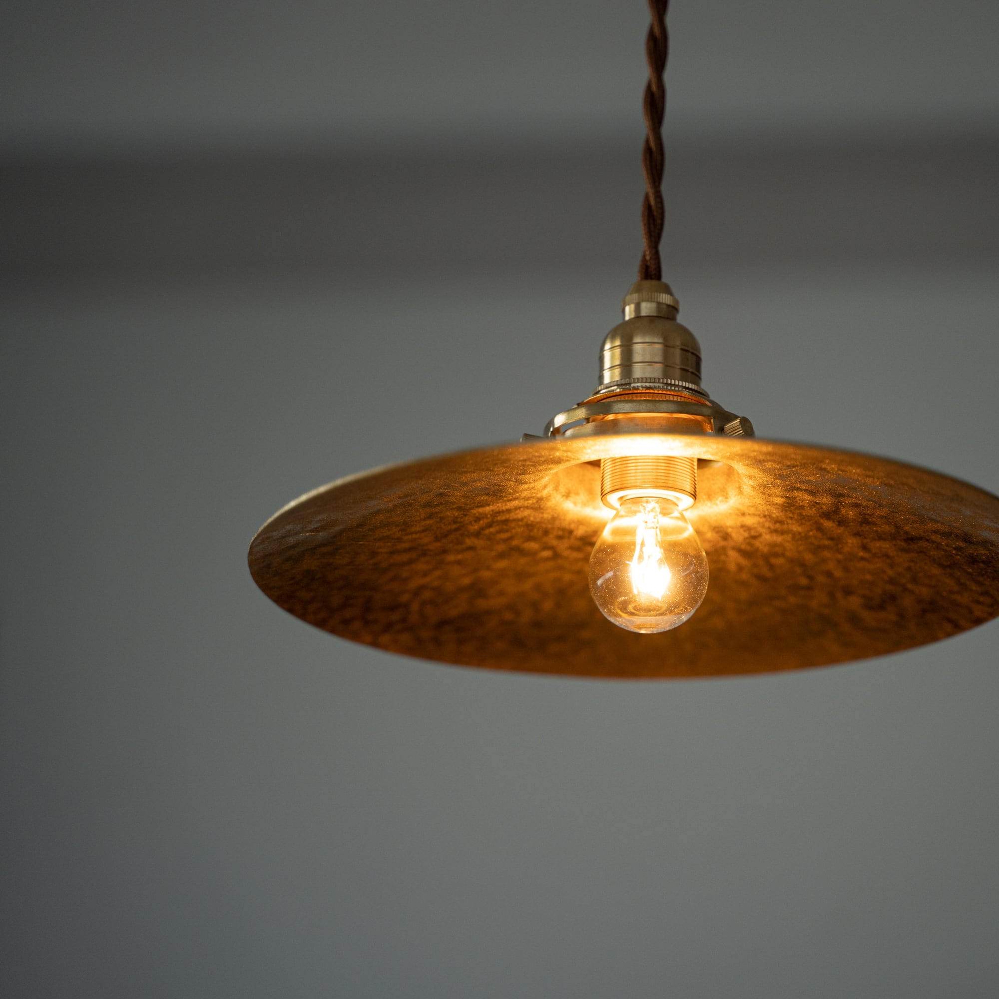 昭和時代に普及した乳白ガラスの電笠をモチーフに、鍛金技法で制作したペンダントランプです。