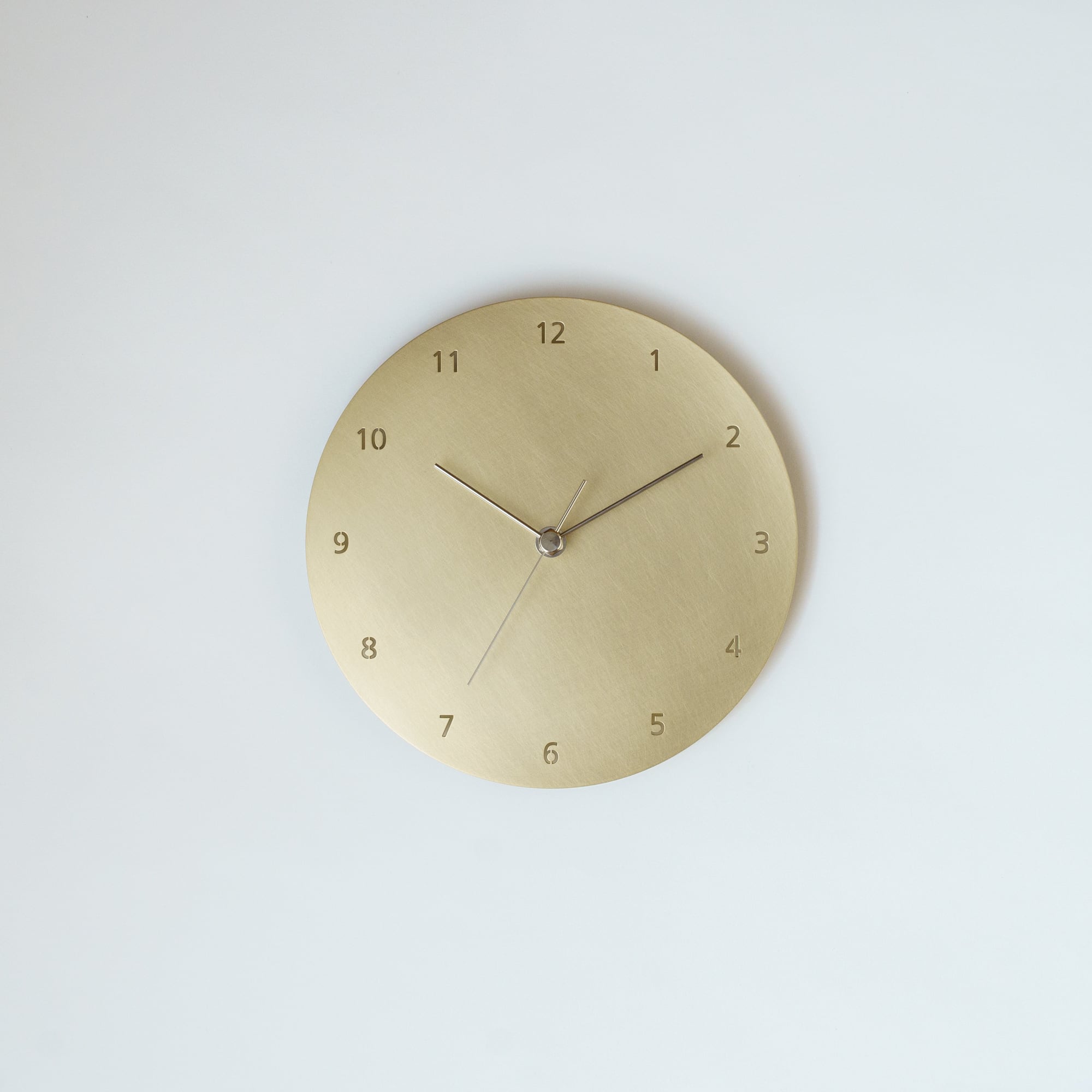 真鍮の板と針だけのミニマルウォールクロック。数字入りタイプの小ぶりな時計(文字盤直径22cm)です。