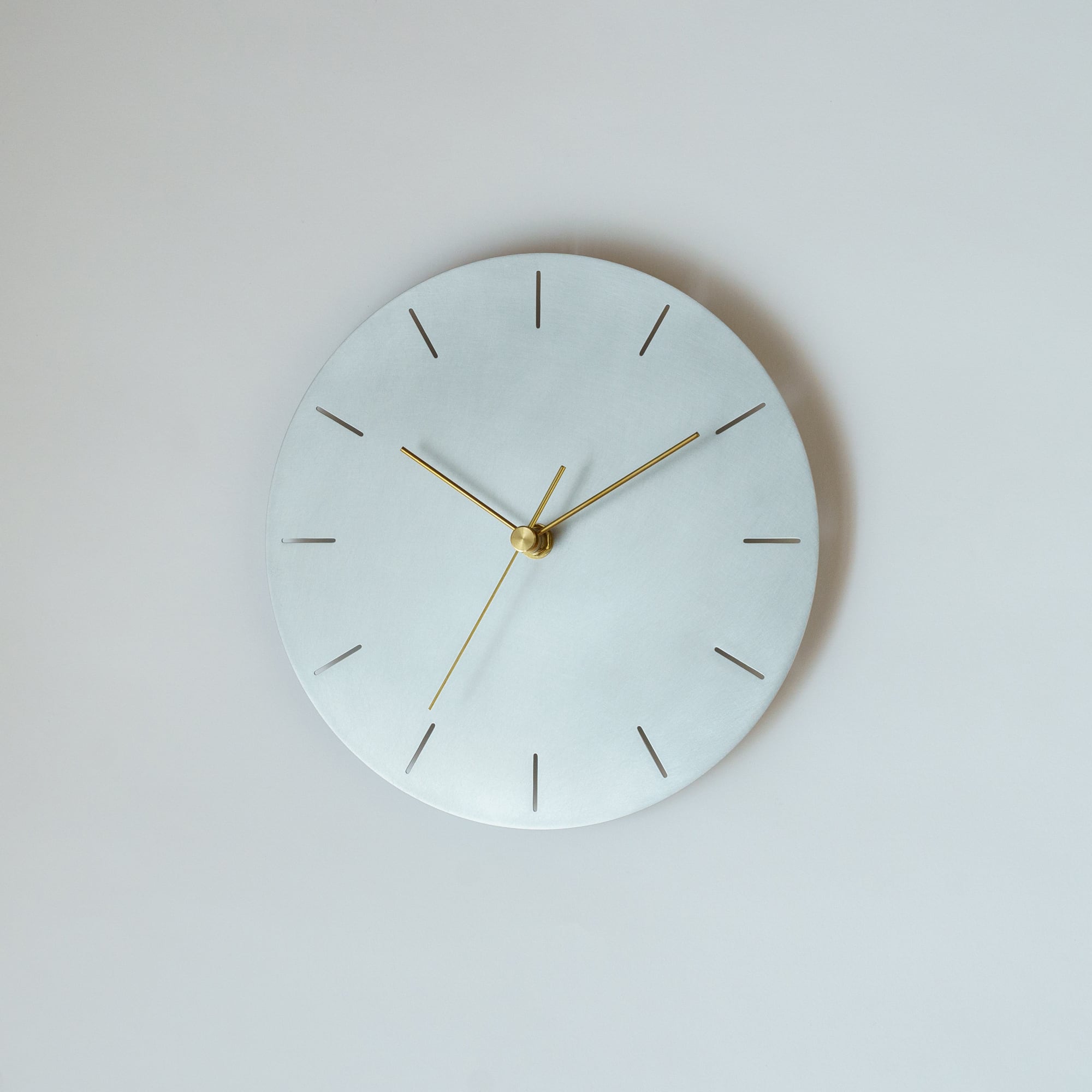 アルミニウムの板と針だけのミニマルウォールクロック。しるし入りタイプの小ぶりな時計(文字盤直径22cm)です。