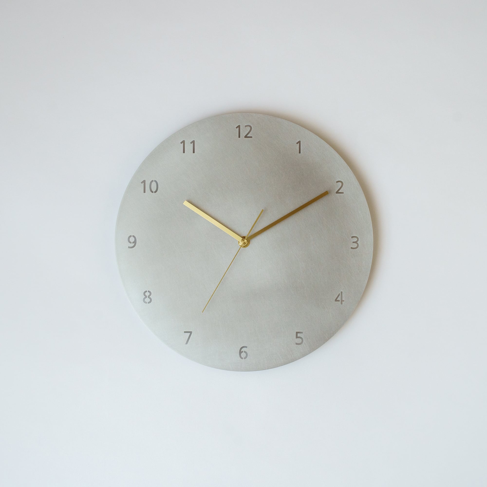 アルミニウムの板と針だけのミニマルウォールクロック。数字入りタイプの大きな時計(文字盤直径30cm)です。
