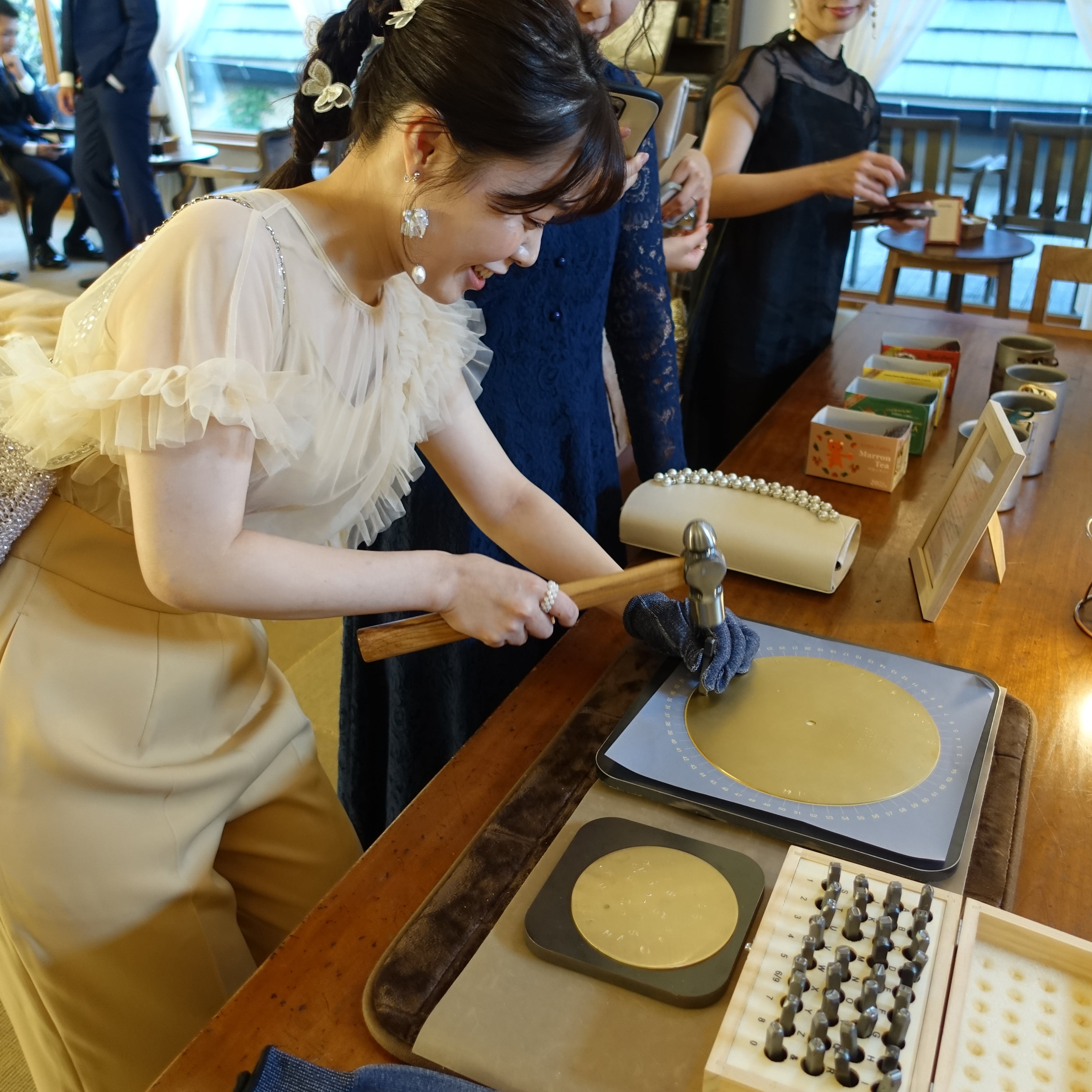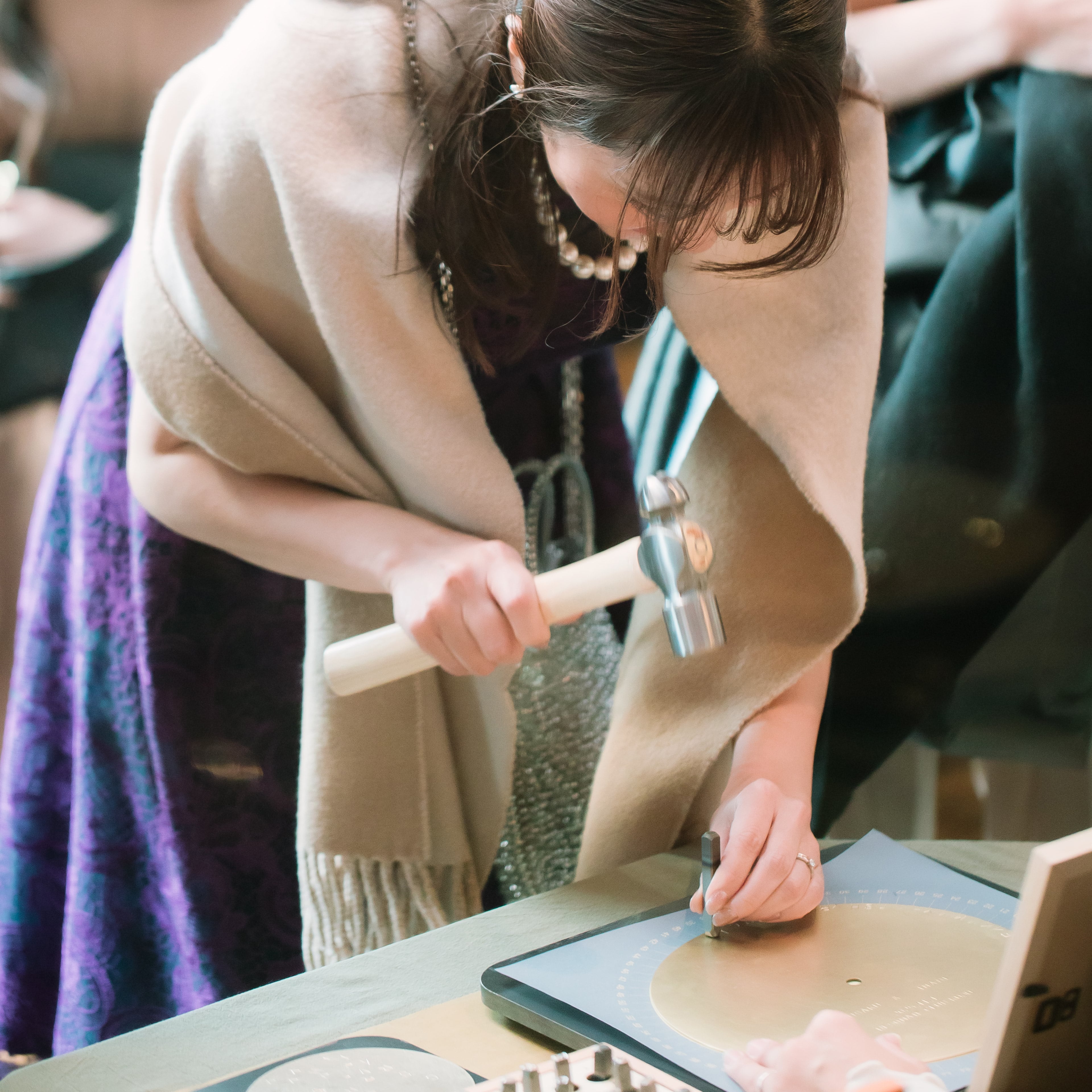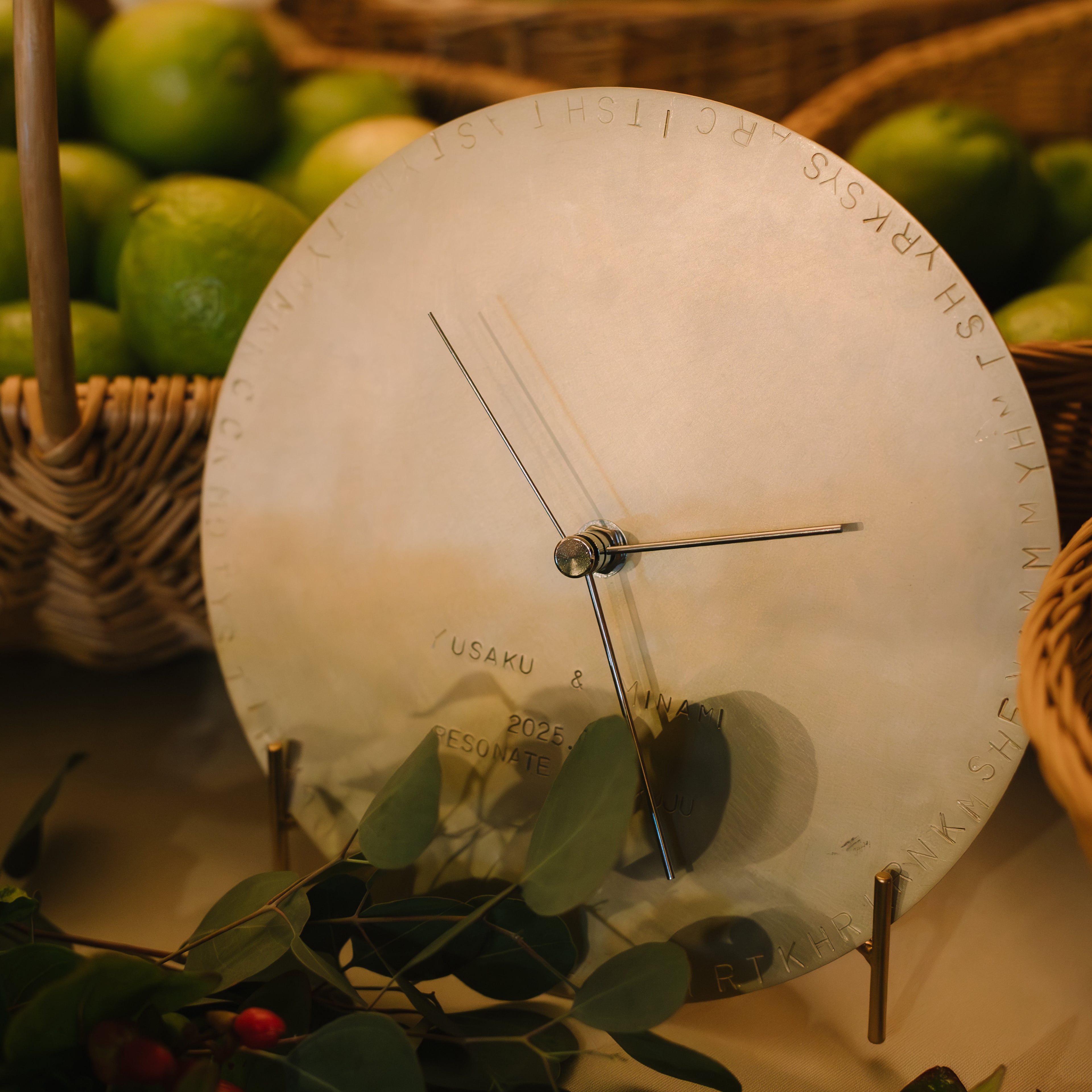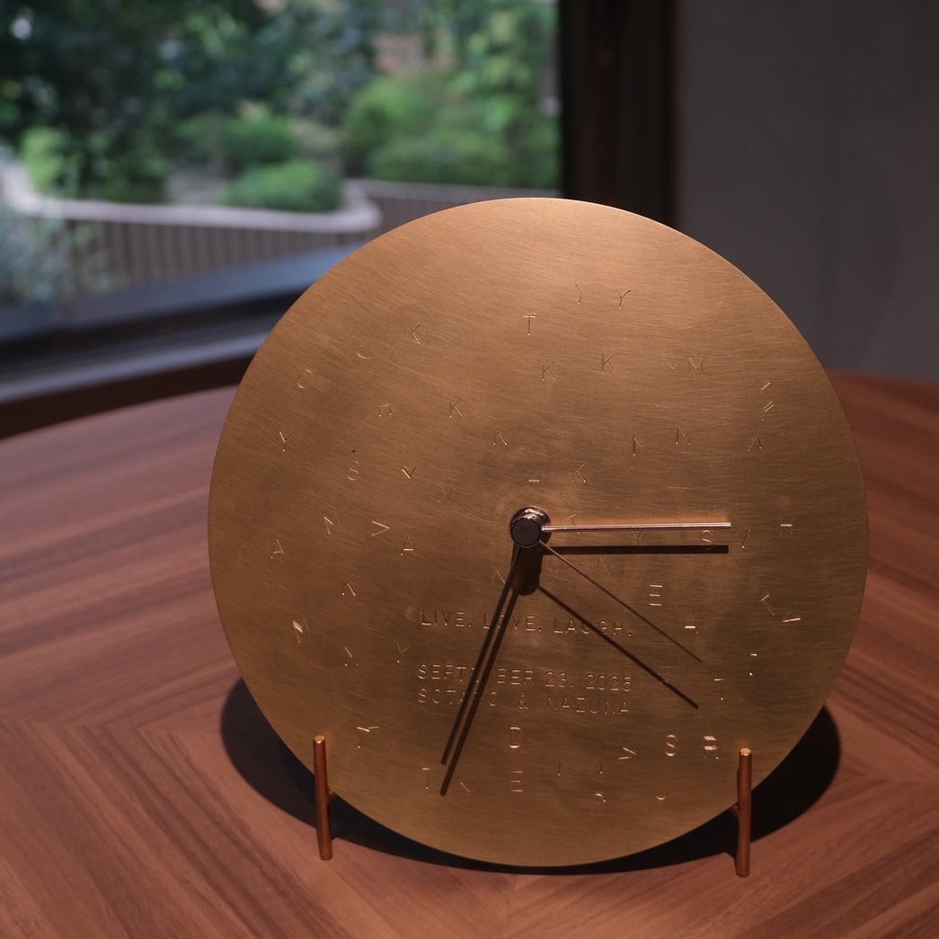 KUMIJIの真鍮製壁掛け時計に、新郎新婦様およびゲスト皆様のイニシャルを刻印する結婚証明書です。