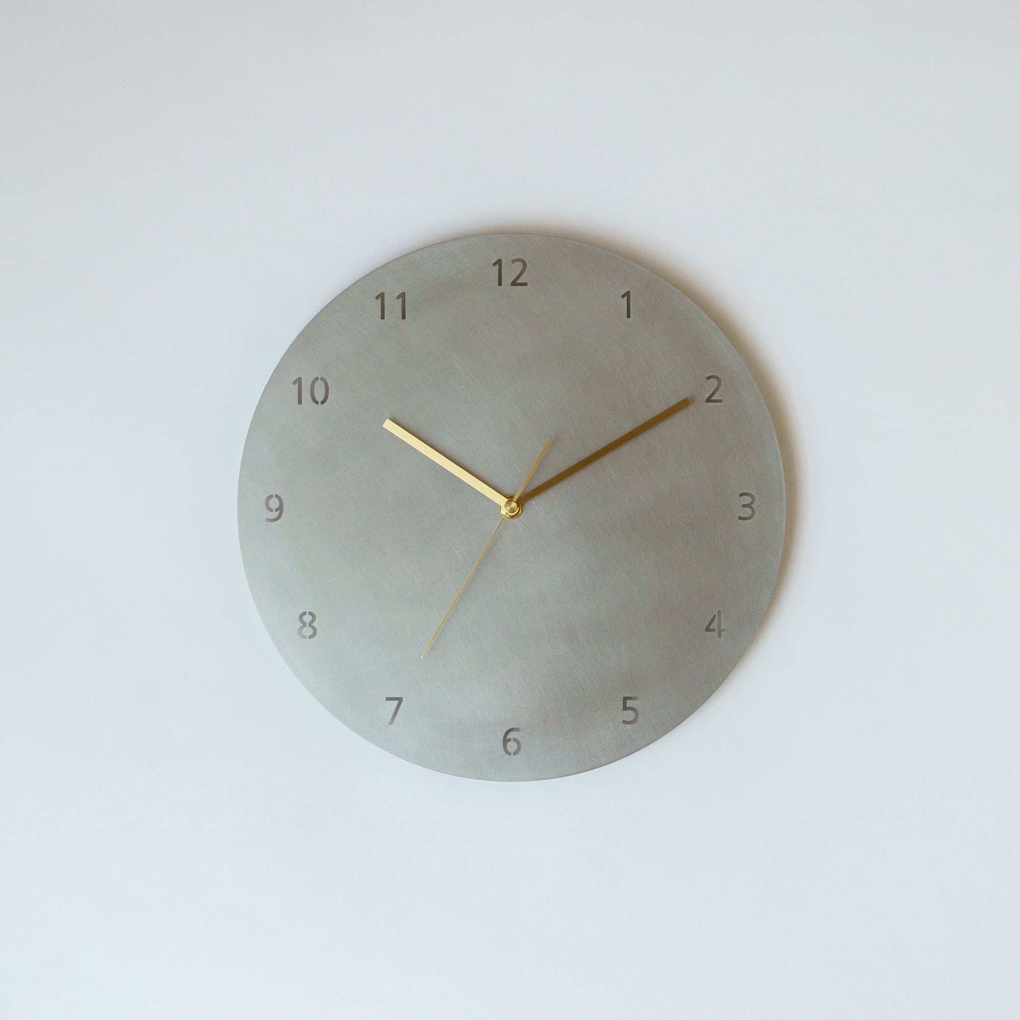 ステンレスの板と針だけのミニマルウォールクロック。数字入りタイプの大きな時計(文字盤直径30cm)です。